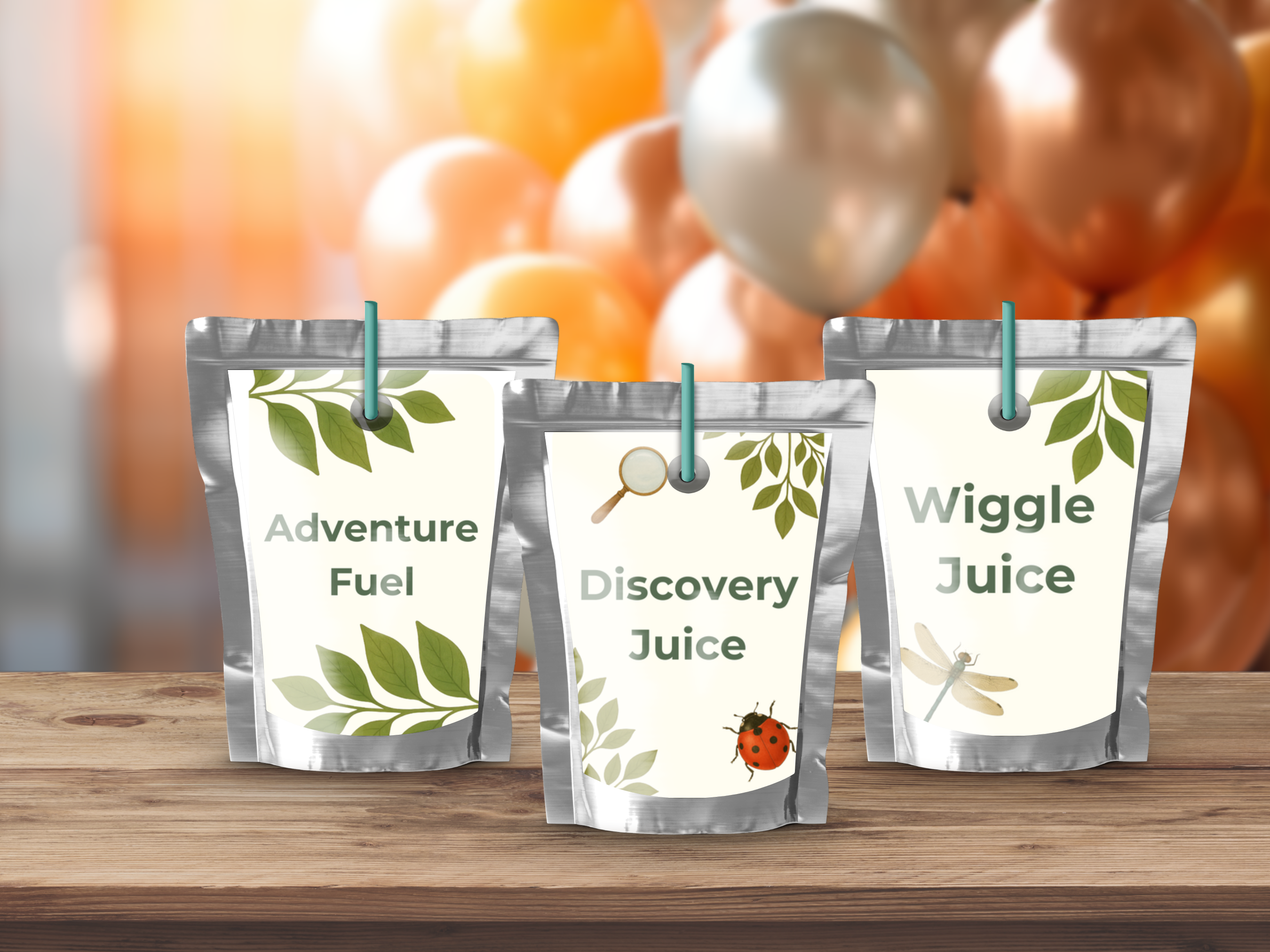 From invitations and favor tags to juice pouch labels and milestone boards, everything we make is designed to be edited easily in Canva and printed at home or your favorite print shop.